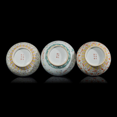 One decorated with cranes and colored clouds, the second with bats and colored clouds, the third with dragons and bats; undersides with six character Guangxu marks