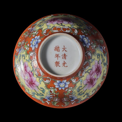 Having rounded walls rising to a slightly flared mouth, the exterior painted with lotus scrolls against a coral-red ground, the underside bearing an apocryphal Guangxu six-character iron red mark.