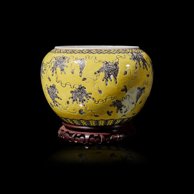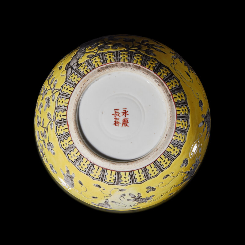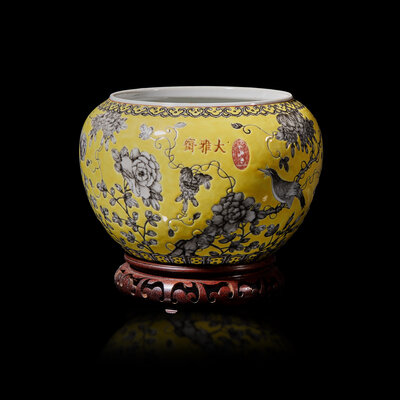 A Chinese Grisaille Decorated Yellow Ground Porcelain 'Bird and Flower' Washer, 20th Century