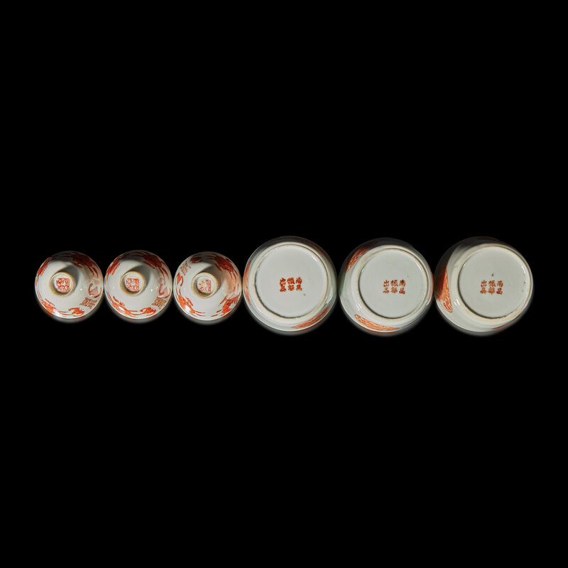 The smaller set each decorated with bats and peaches alternating shou characters, the underside bearing a Tongzhi four-character iron red seal mark; the larger set decorated with dragon roundels, the underside bearing an iron red maker's mark.