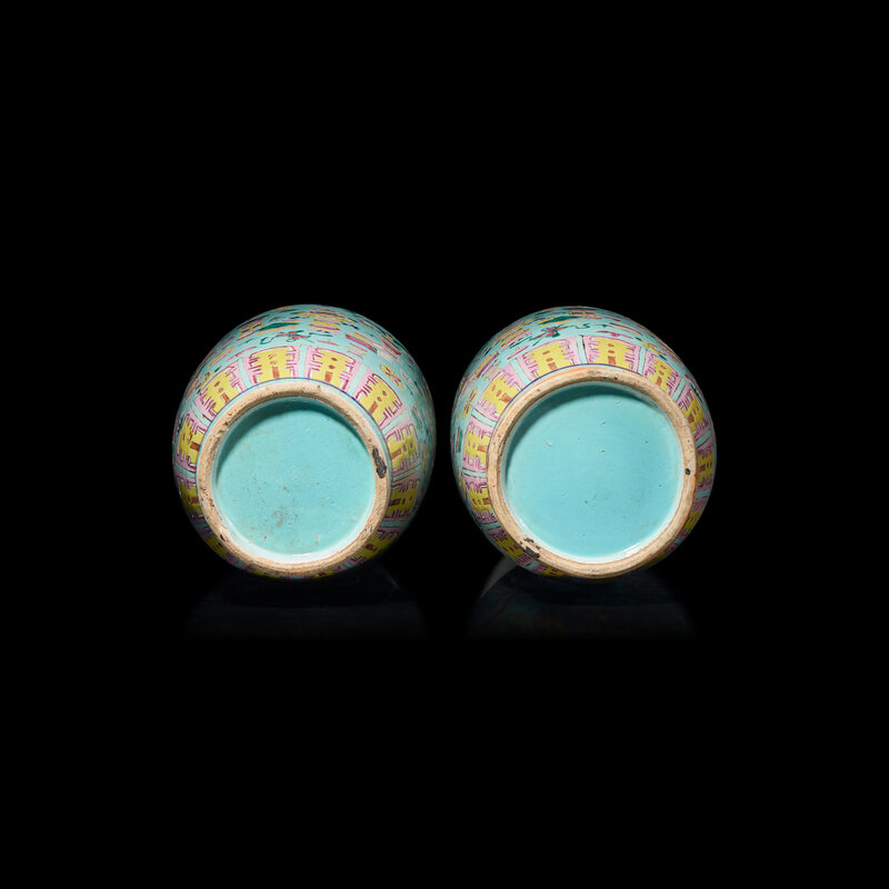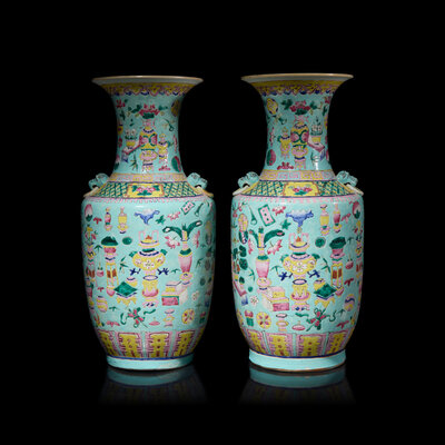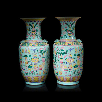 Each baluster vase painted with various precious objects, all against a light turquoise blue ground.