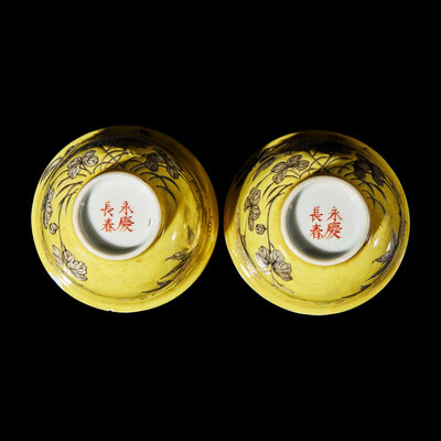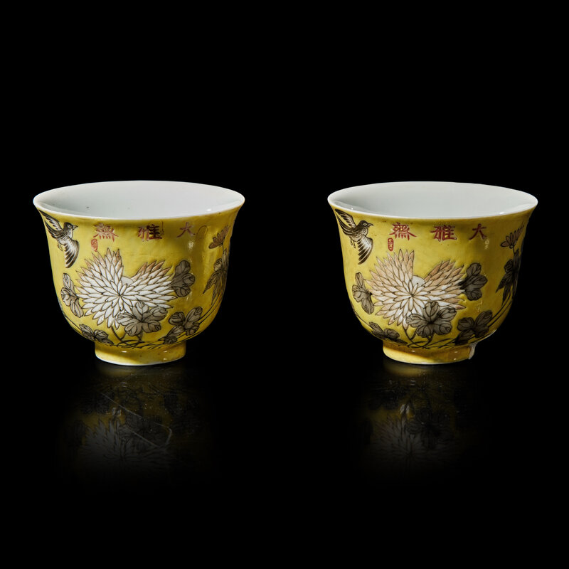 A Pair of Chinese Yellow Ground Porcelain Cups, 20th Century
