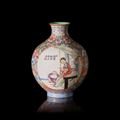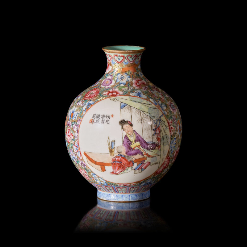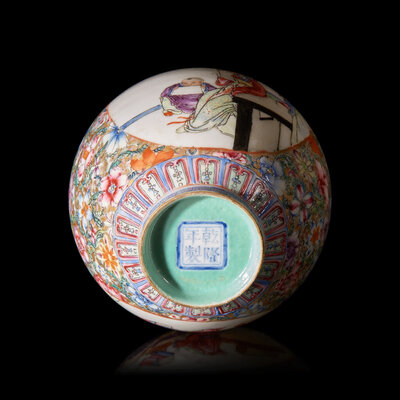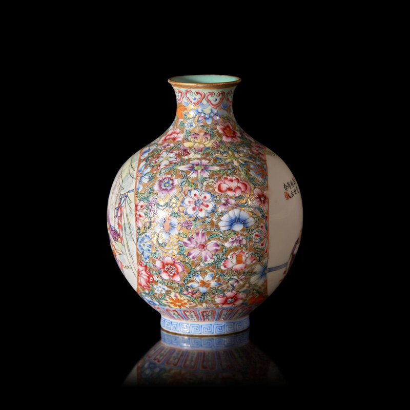 Finely painted with two figural reserves against a millefiori ground, underside with apocryphal Qianlong mark.