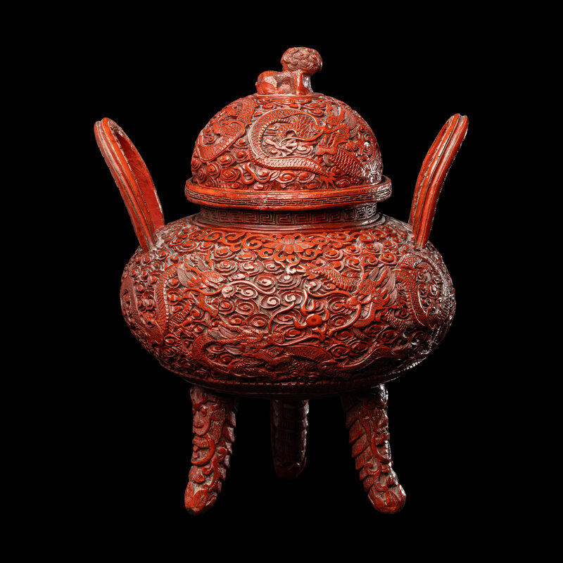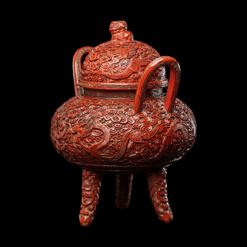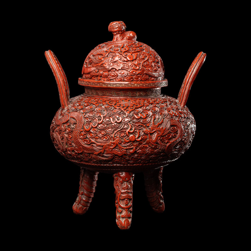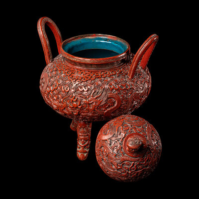 A Chinese Cinnabar Lacquer on Metal Covered Ding Vessel, Late Qing/Republic Period