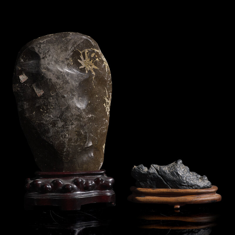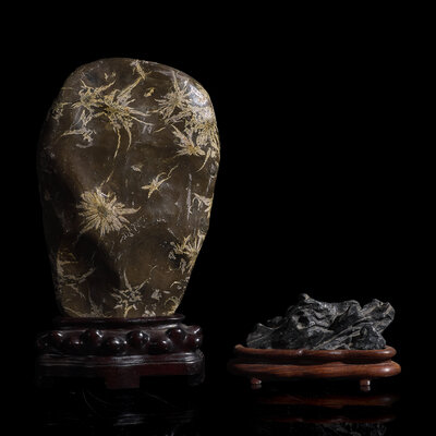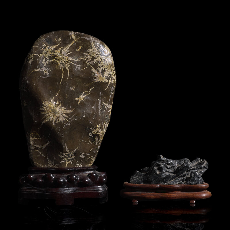 Including one "Chrysanthemum" stone and a small horizontally oriented "Lingbi" stone, wood stands.