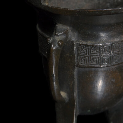 Cast with two bands of fret motifs around its body, featuring a handle styled as a bird with two prominent, bulging eyes, covered in a dark patina.