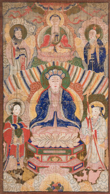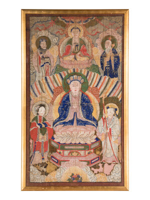 Depicting a crowned seated figure flanked by attendants, below a Buddha flanked by Immortals