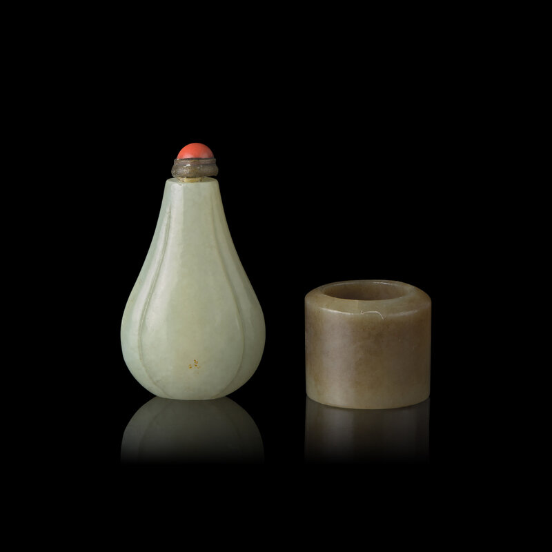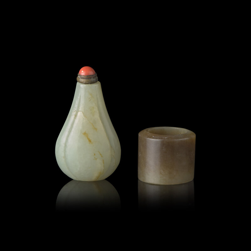 A Chinese Pale Celadon Jade Lobed Snuff Bottle and a Russet Jade Archer's Ring, 19th Century