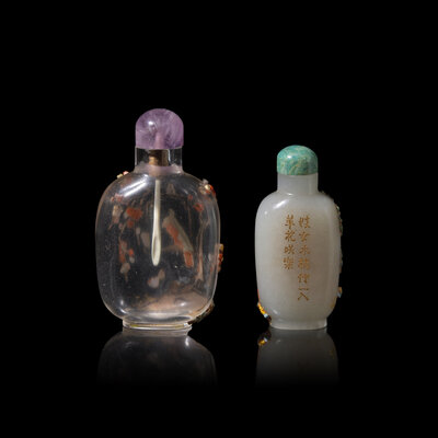 Comprising a fine rock crystal snuff bottle, embellished with a bird confined within a detailed cage, surrounded by the flowering branches of a prunus tree, and a greyish nephrite jade snuff bottle, with a scene of a meiren admiring a rocky landscape, while the reverse is adorned with an associated poetic inscription.