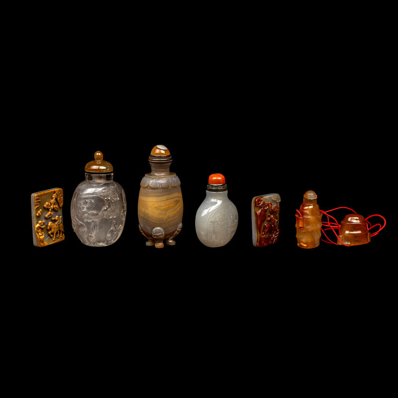 Comprising a white snuff bottle, a grey snuff bottle, a brown snuff bottle, and two rectangular silhouette plaques.
