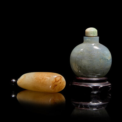 the jade bottle of pebble form, the even stone with russet patches; the greyish jadeite example incised with a seated Buddha, both with associated stopper.