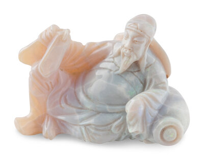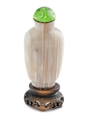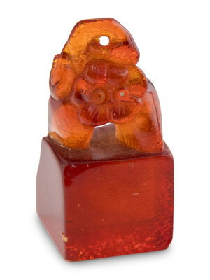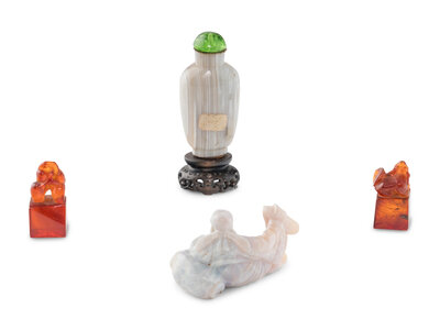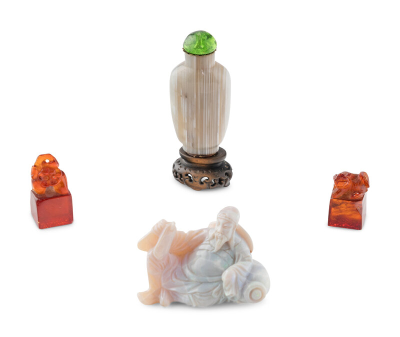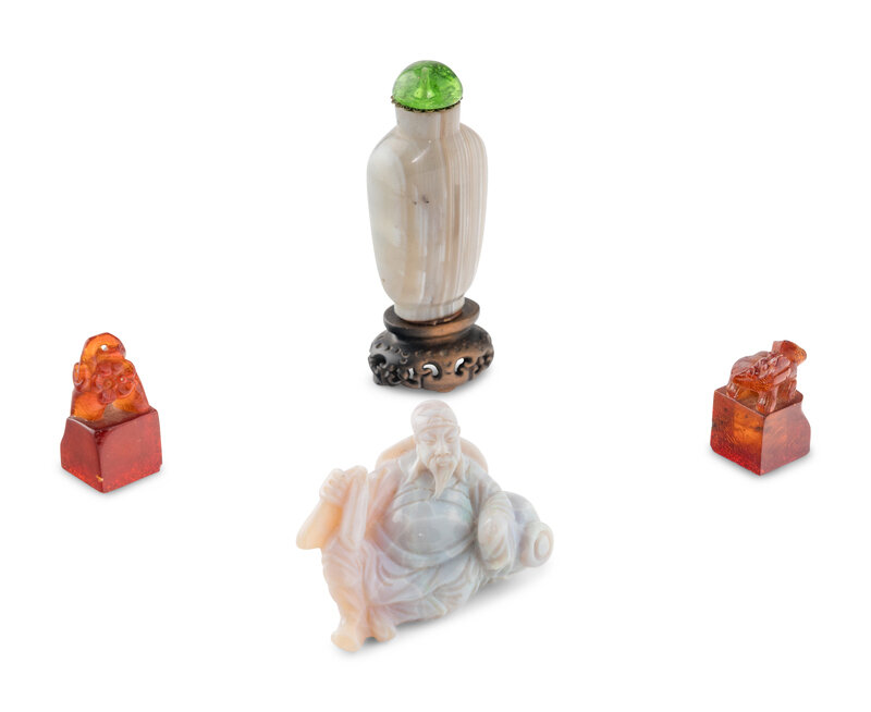 Comprising a banded agate snuff bottle, two amber seals, and an agate carving of a figure.