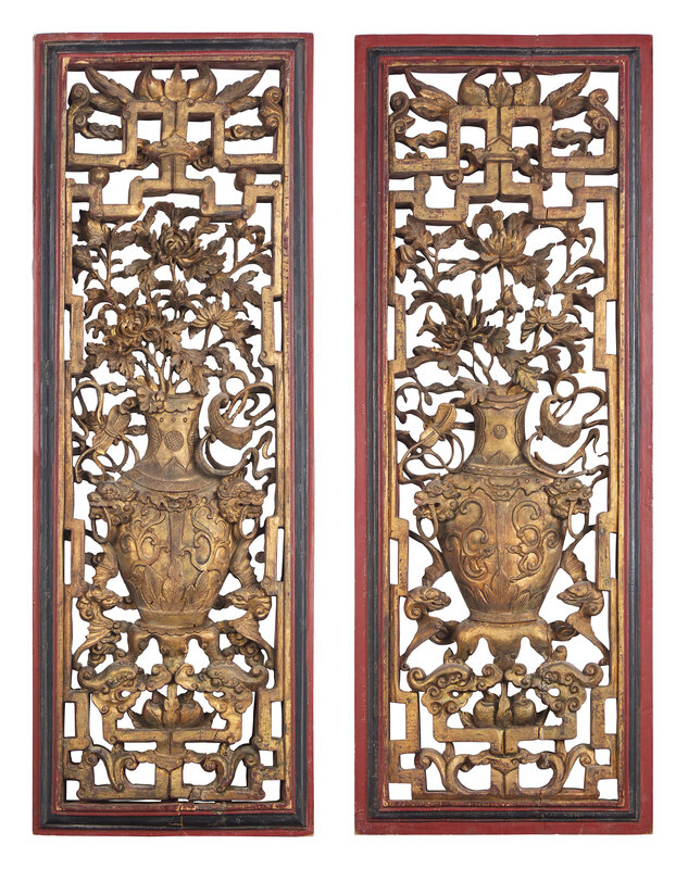 A Pair of Chinese Carved and Lacquered Wood Openwork Panels, Qing Dynasty