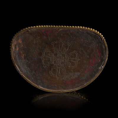 The richly gilded figure depicts a seated Buddha in the earth-touching posture (bhumisparsha mudra), upon a double-lotus seat, base plate incised with a visvavajra