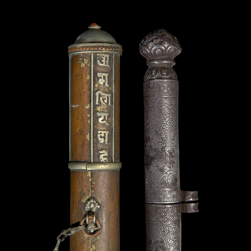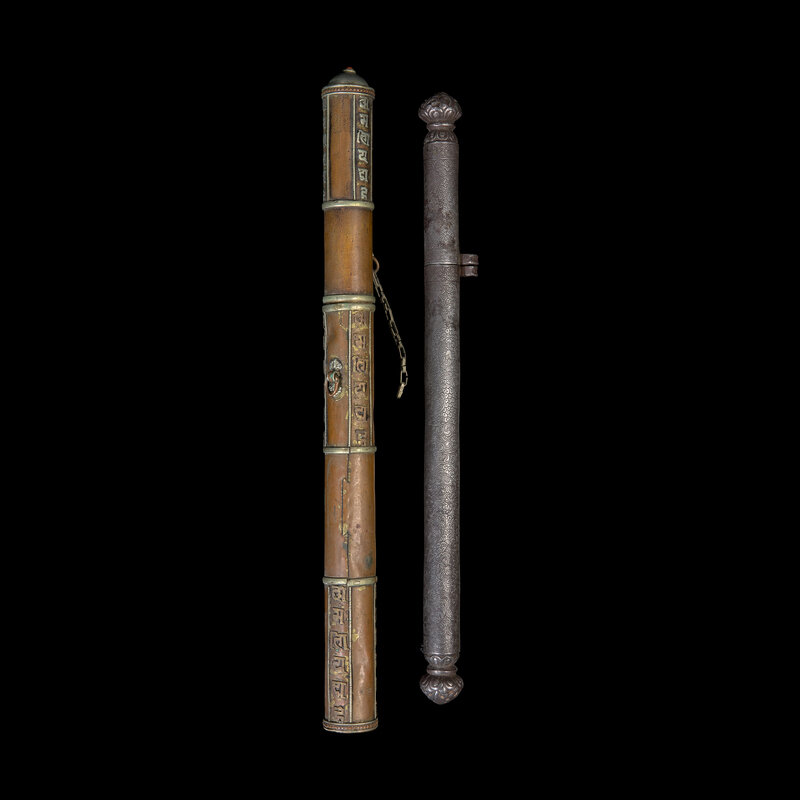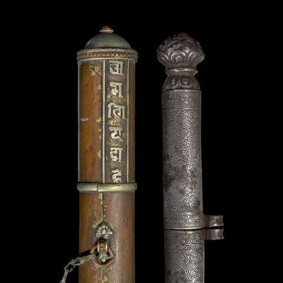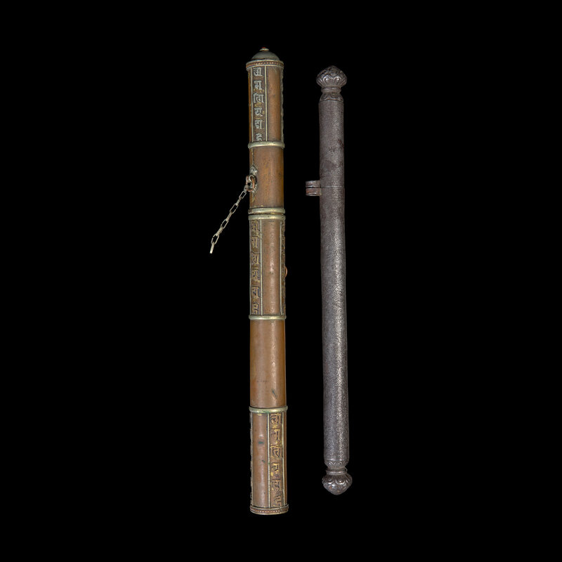 The first is a larger metal case inscribed with Tibetan scripts; the other is decorated with elaborate floral motifs.