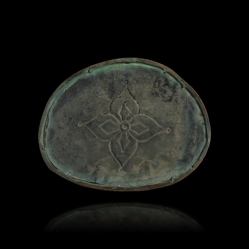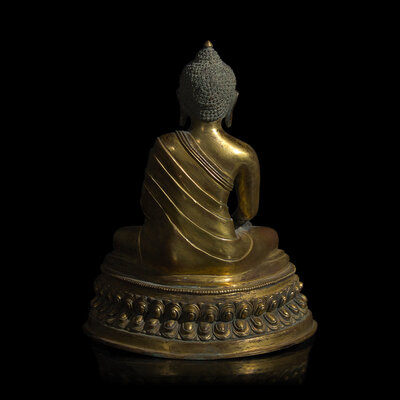 Depicted seated in vajrasana, one hand in bhumisparsha mudra, a vajra before him, on a double lotus base, underside sealed.