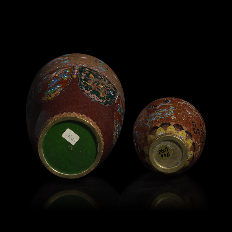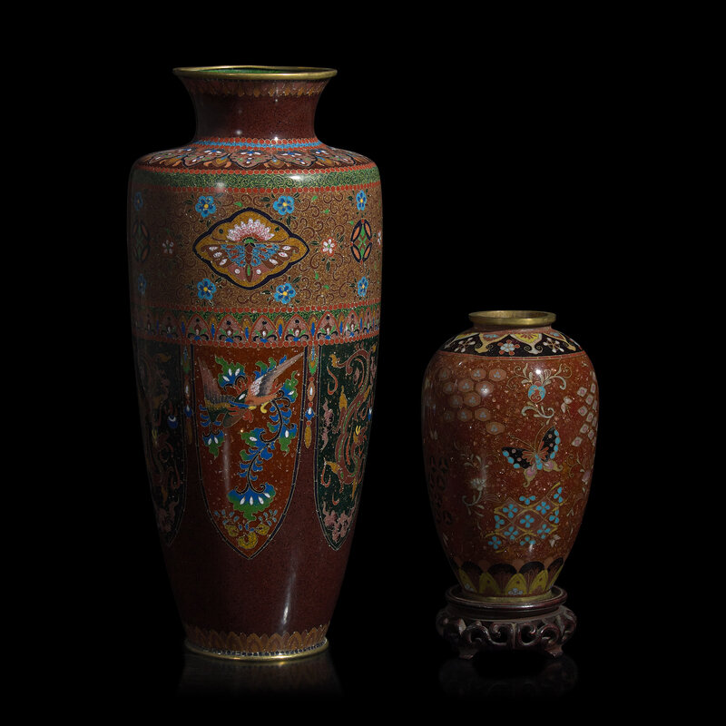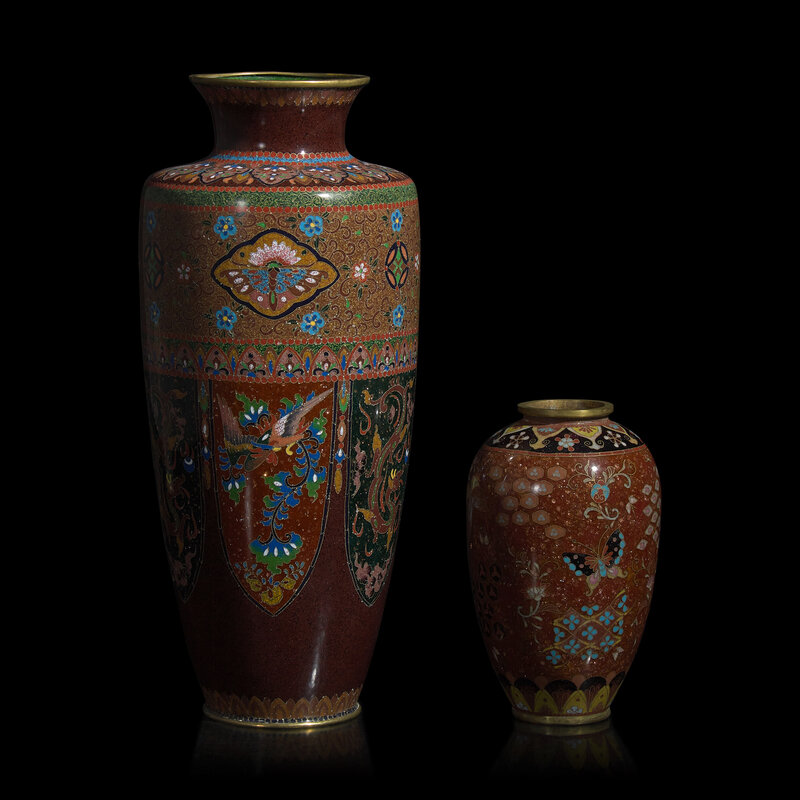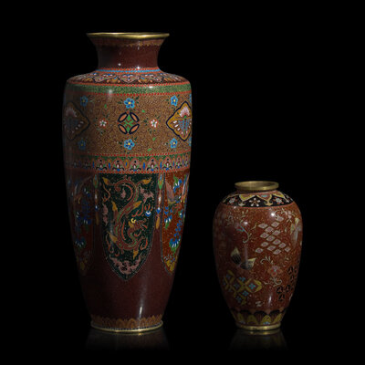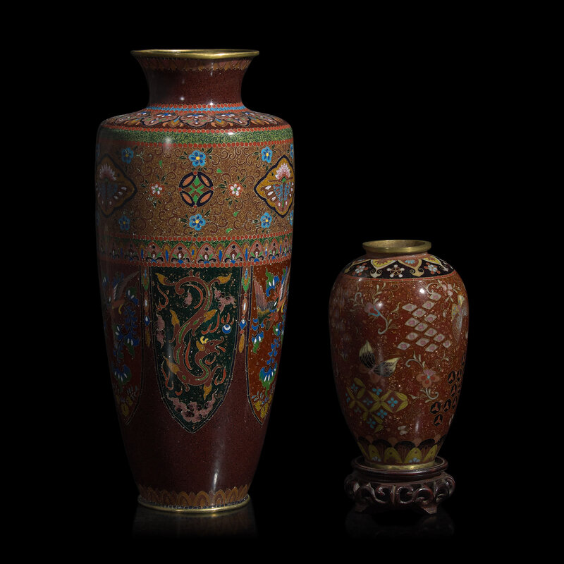 Two "Aventurine" Ground Japanese Goldstone Cloisonné Vases, Meiji Period