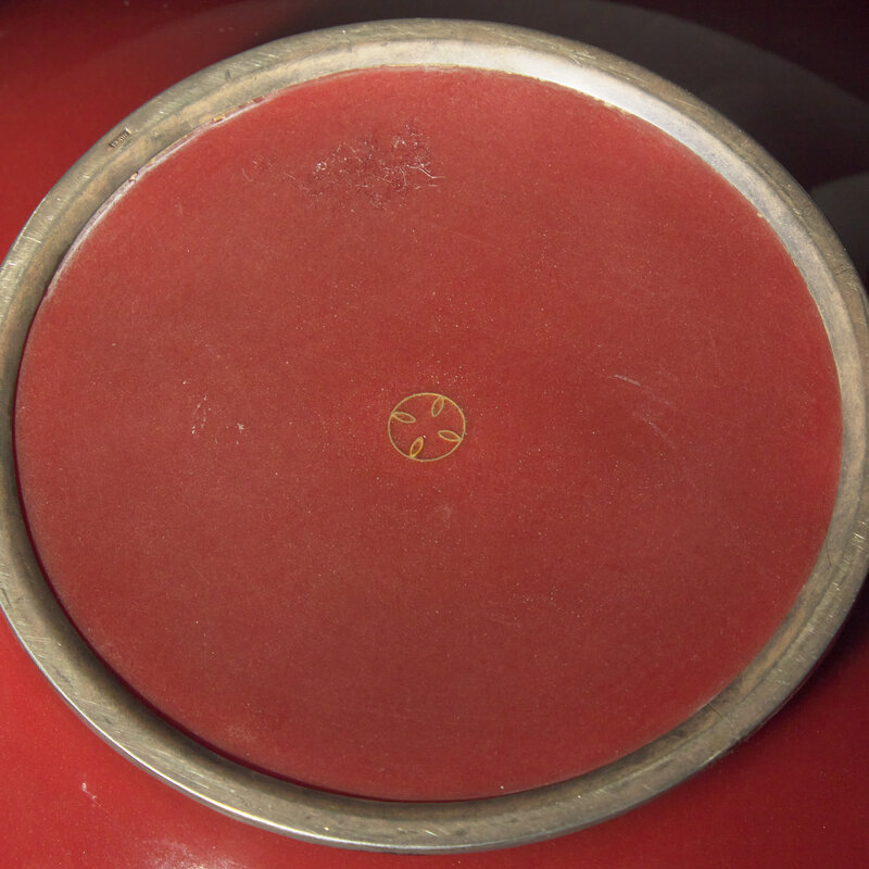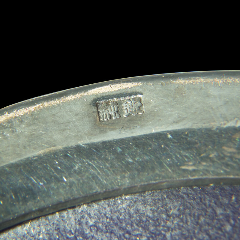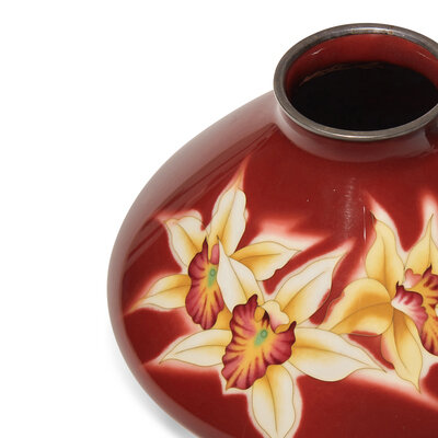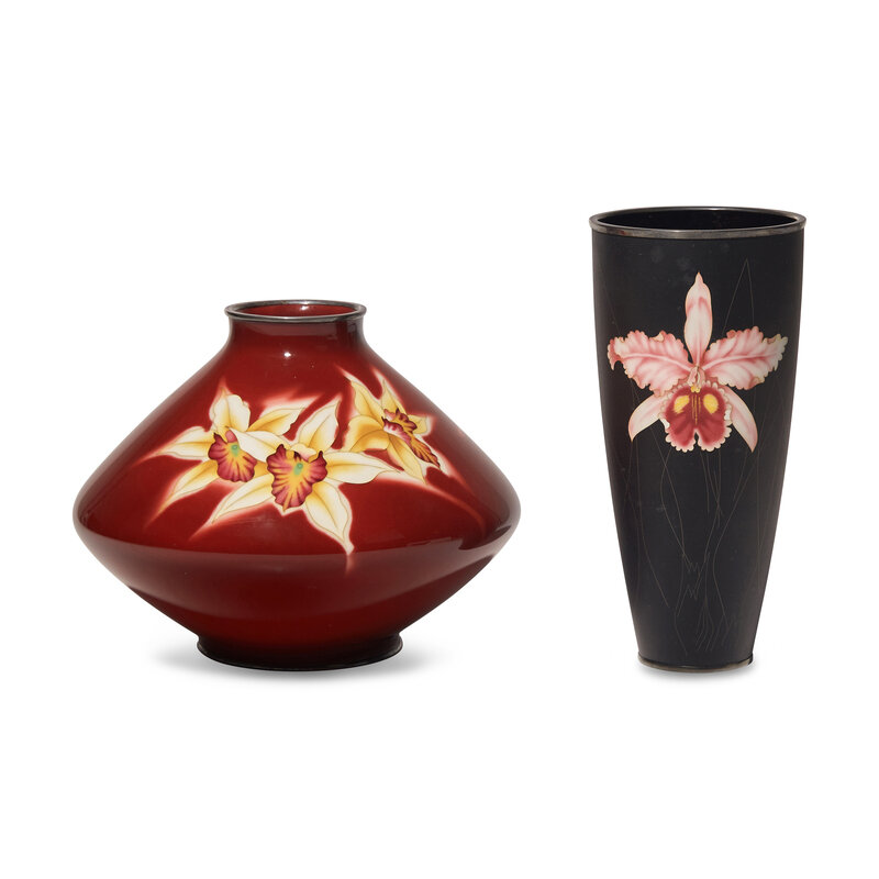 The first, Ando, with red-ground footring stamped SILVER, the other a dark-ground example footring stamped jungin, each with orchid decoration.