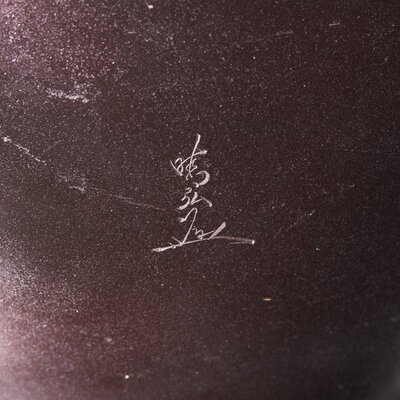 The globular vase decorated with swimming koi fish in low relief, incised signature to one side.