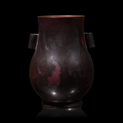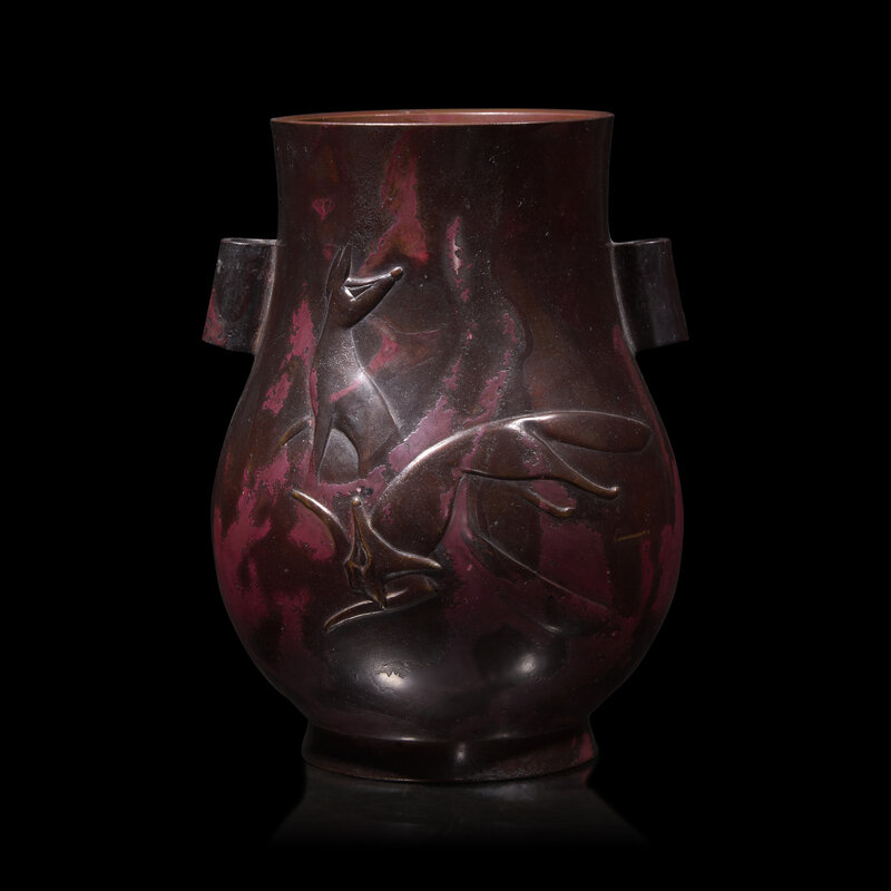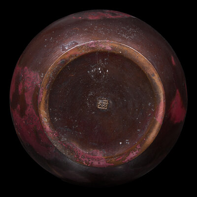 The exterior modelled with foxes, the recessed neck flanked by a pair of lug-form handles, thickly-splashed red and brown patina, underside with maker's seal.