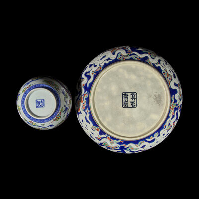 The stoneware dish decorated on the exterior with paired fish and fuku and ju roundels with auspicious symbols against a gosu blue ground, the interior with a sinuous dragon and stylized floral sprays, underside signed Makuzu Kozan sei in underglaze blue; the globular vase with slightly flared lip, copper rim, the vase decorated with intertwined dragons among colorful clouds, underside signed Kozan sei in underglaze blue within a double square,