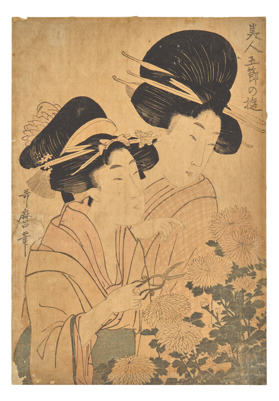 -Two Bijin Selecting Chrysanthemum Blossoms, Sheet: 14 1/2 x 10 in.; 36.8 x 25.4 cm.