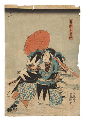 -Utagawa Kunisada, right panel from a Kanahedon Chushingura triptych showing a warrior with large mallet, sheet: 14 1/2 x 9 7/8 in.