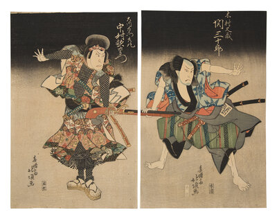 -Shunshosai Hokucho, diptych (possibly from a triptych) showing two warriors contesting a rifle, sheet: 14 3/4 x 9 1/2 in.