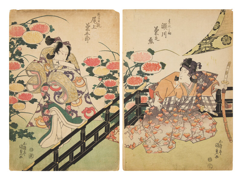 Utagawa Kunisada: A diptych, likely from a triptych, showing two actors among chrysanthemums, sheet: 14 5/8 x 10 1/8 in.
