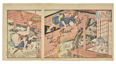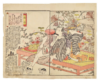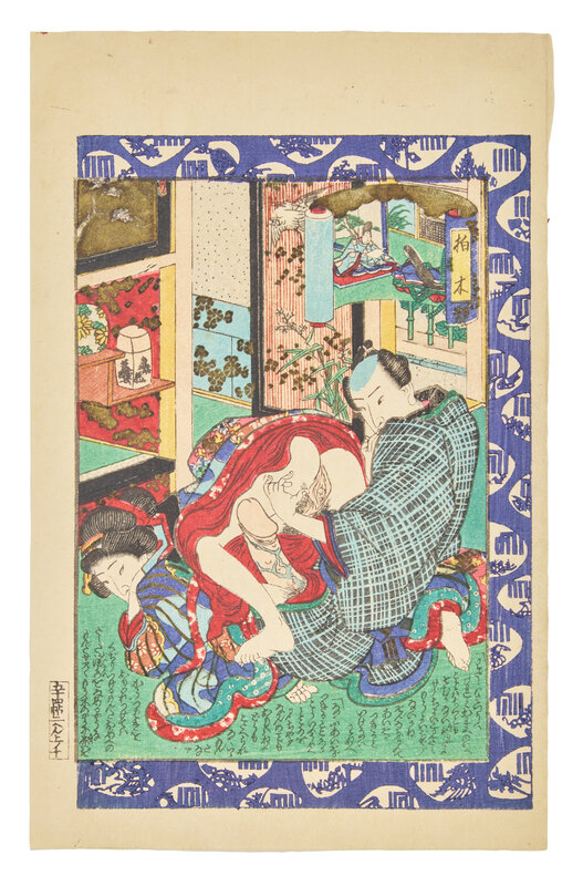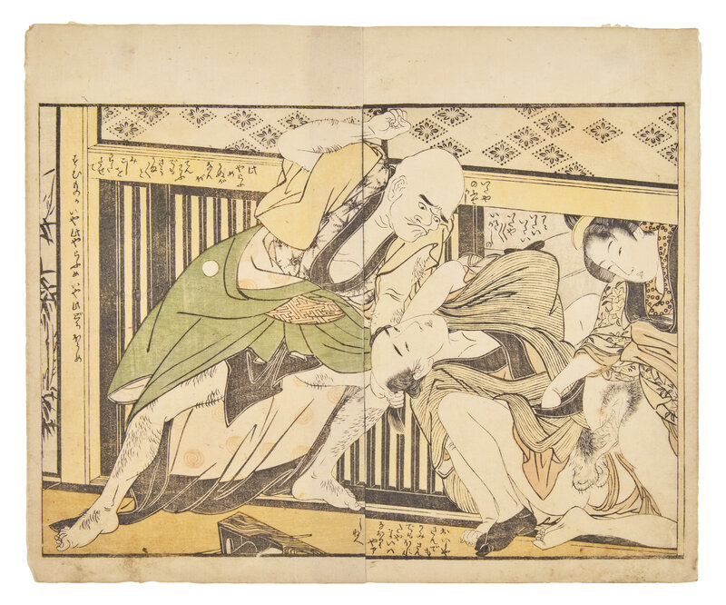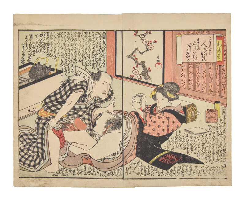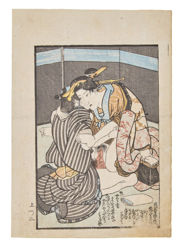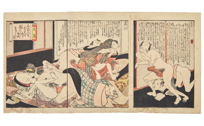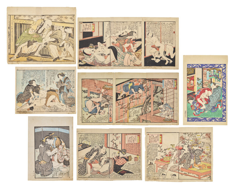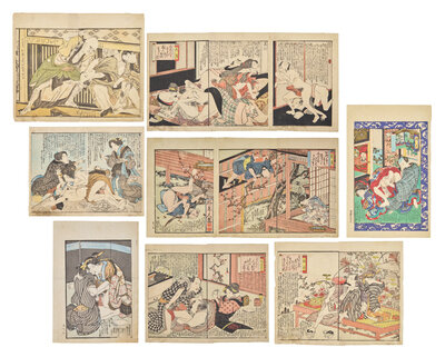 Primarily removed from shunga albums including works by Toyokuni I (a double-page spread), Utagawa Kunitora (four double-page spreads and two single pages from Danjo Sugata, circa 1830-1840), Kitagawa Utamaro (a double-page spread), and two single pages.