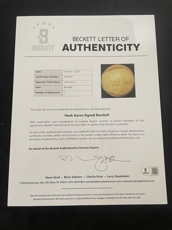 A Hank Aaron Single Signed Autograph Baseball - Vintage Signature (Beckett Authentication Services Letter)