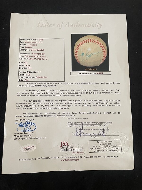 A Joe Cronin Single Signed Autograph Baseball (JSA Letter)