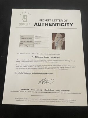A Joe DiMaggio Signed Autograph Photo (Beckett Authentication Services Letter)