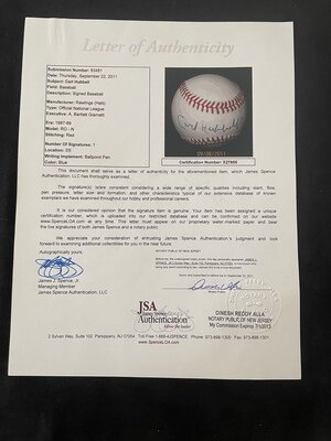 A Carl Hubbell Single Signed Autograph Baseball (JSA Letter)