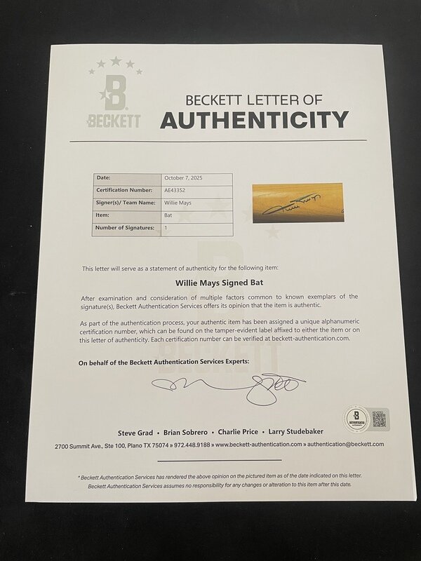 A Willie Mays Signed Autograph Bat (Beckett Authentication Services Letter)