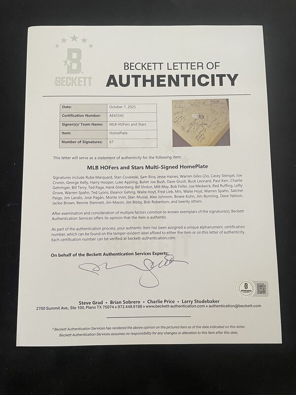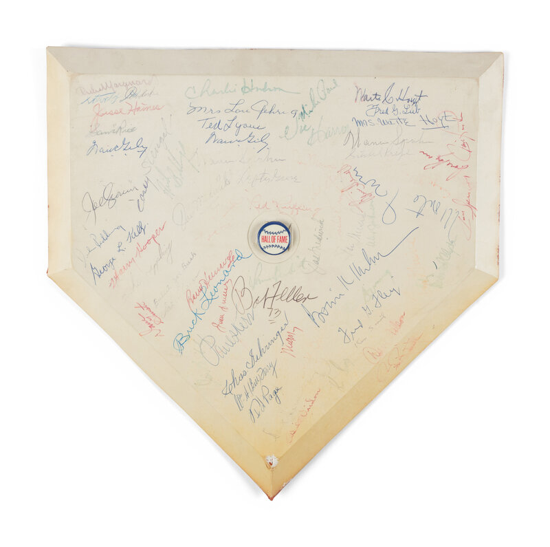 A Baseball Hall of Fame and Notables Signed Autograph Home Plate - 67 Signatures Including Satchel Paige (Beckett Authentication Services Letter)