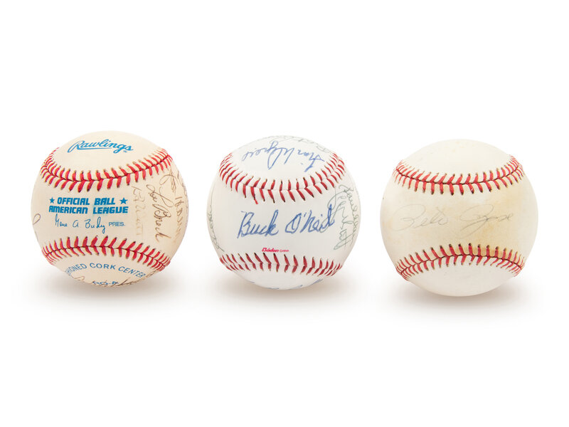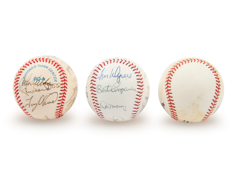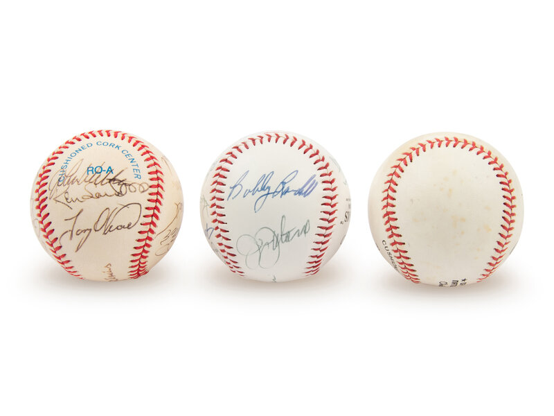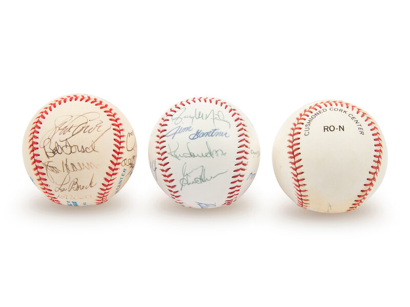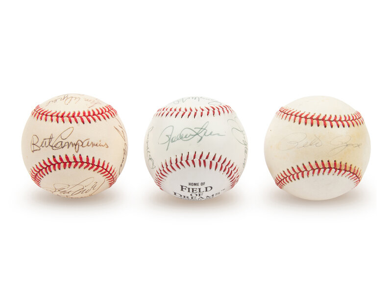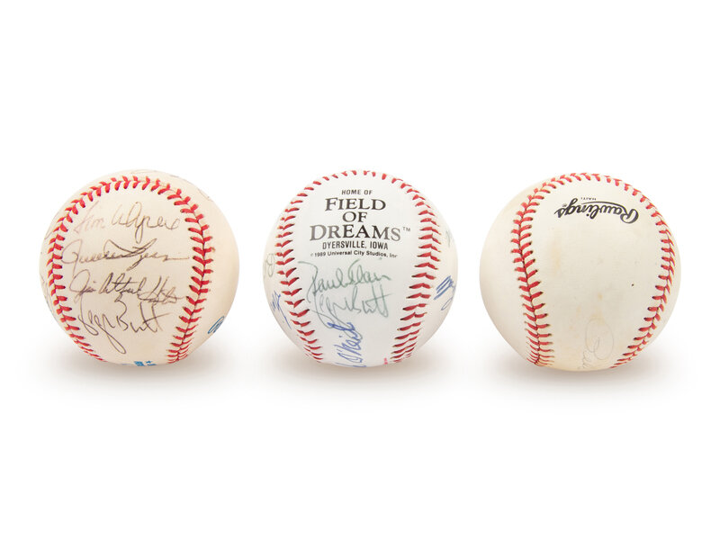 comprising Ball 1: Field of Dreams commemorative baseball with 13 signatures including George Brett and Buck O'Neil; Ball 2: official American League baseball with 13 signatures including George Brett, Jim Catfish Hunter, Lou Brock and Tony Oliva; Ball 3: Pete Rose single signed official National League baseball.