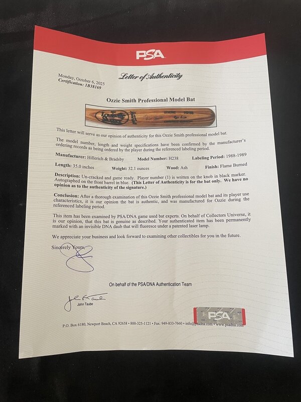 A 1988-89 Ozzie Smith Signed Autograph Game Issued Professional Bat (PSA Letter)