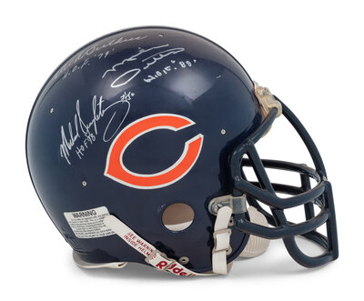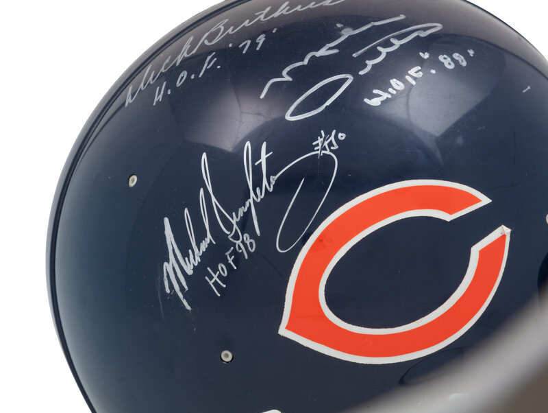 Vintage Riddell full size Chicago Bears helmet comprising silver ink signatures of Walter Payton, Mike Ditka, Dick Butkus, Gale Sayers and Mike Singletary.