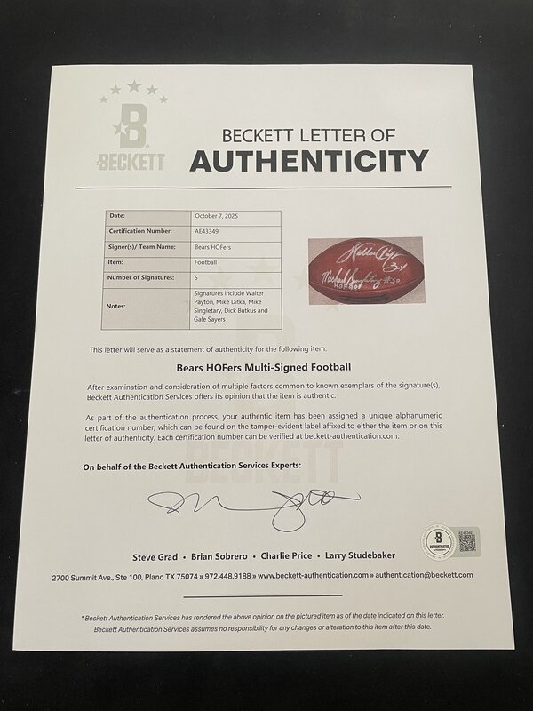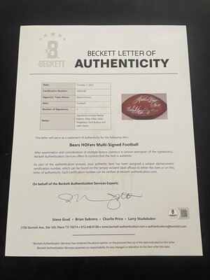 A Chicago Bears Hall of Fame Signed Autograph Football Including Walter Payton (Beckett Authentication Services Letter)