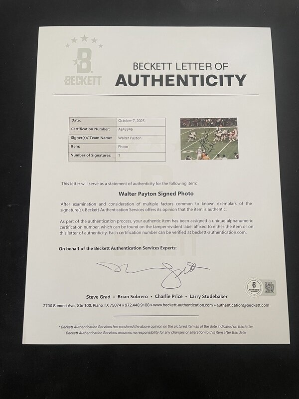 A Walter Payton Signed Autograph Original Unpublished Super Bowl XX Photograph (Beckett Authentication Services Letter)