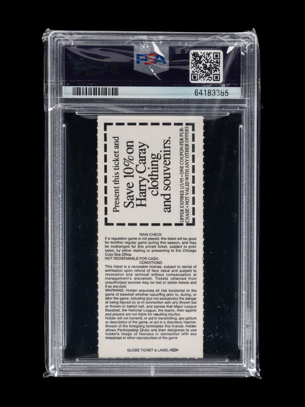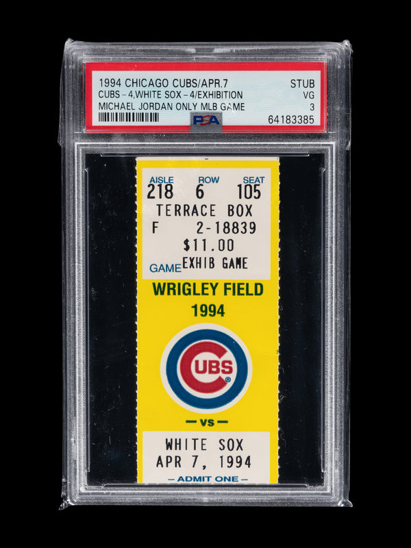 Comprising a rare group of material from Michael Jordan's memorable appearance in the April 7, 1994 exhibition between the Chicago White Sox and Chicago Cubs at Wrigley Field. Jordan wowed the fans at the Friendly Confines finishing the day 2-for-5 at the plate including a game-tying double in the seventh inning. Only 32 Wrigley Field box office stubs from this memorable moment in the brief baseball career of Michael Jordan have been graded by PSA.