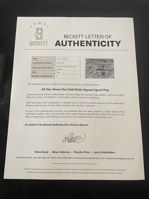 comprising signatures of Michael Jordan, Stan Mikita, Rex Grossman, Billy Williams, Jim McMahon, Gale Sayers, Mike Ditka, Bo Jackson, Carlton Fisk, Bobby Hull, Jay Hilgenberg, Greg Maddux.