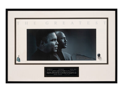 Originally used in the late 1990s as part of a Chicagoland Chevrolet marketing campaign, this image features two of sports greatest legends in a moment of shared reflection. Two strong signatures are added to the display with Ali signing directly on the print and a cut signature of Jordan added after.