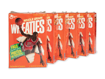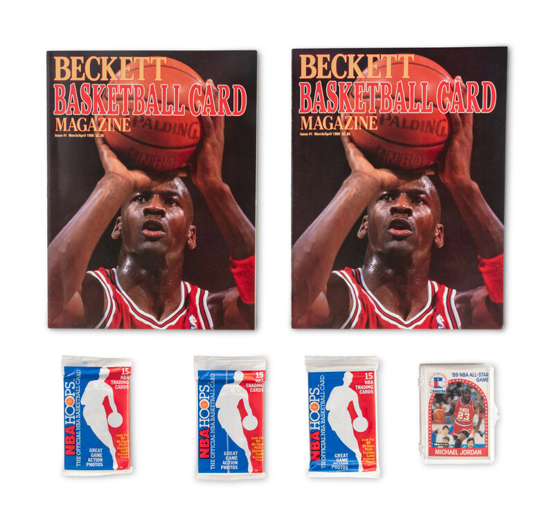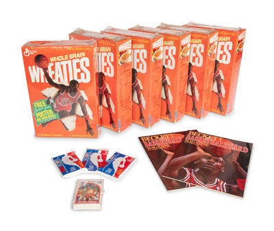 comprising six unopened 1990 Wheaties cereal boxes with Jordan posters; three unopened packs of 1989 NBA Hoops basketball cards with Jordan card No. 200 visible on top; two 1990 premiere issues of Beckett Basketball Card Monthly; 35 assorted 1989 NBA Hoops basketball cards.