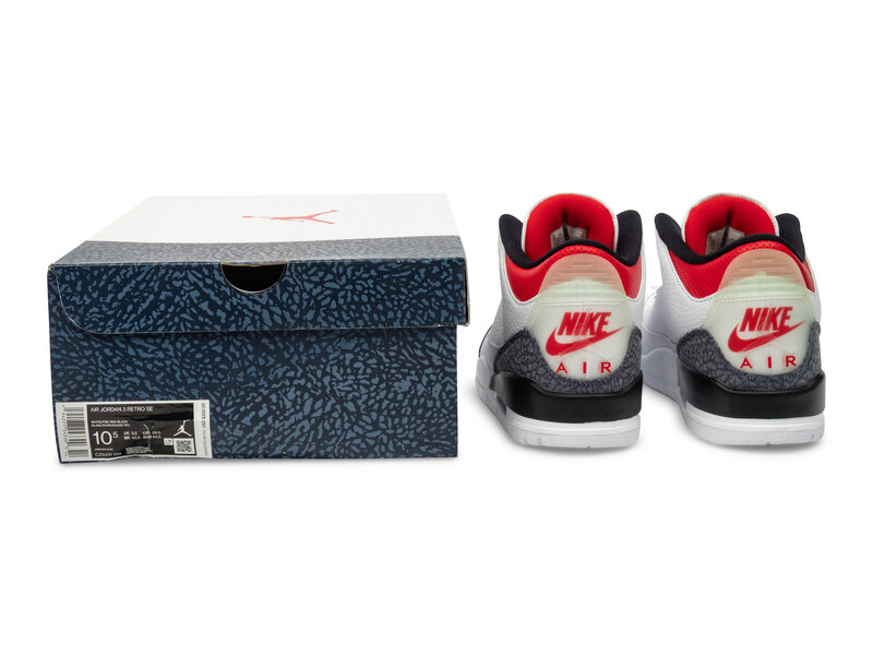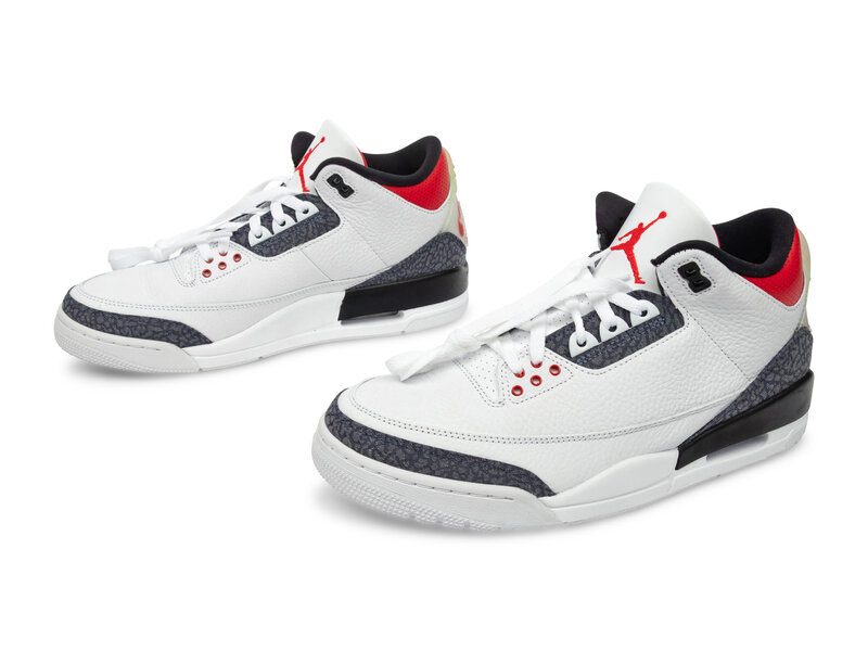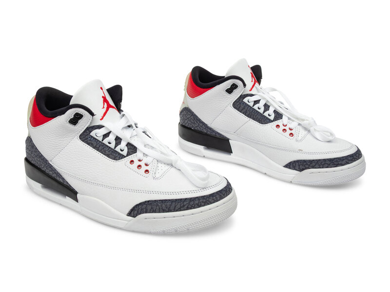 Released on 8/27/20, the "Denim Fire Red" Jordan 3 is inspired by premium Japanese denim and puts a modern twist on a classic. It features a white leather upper with denim-textured overlays, Fire Red accents, and translucent heel tabs showcasing both Jumpman and Nike Air branding. This pair blends heritage style with fresh detailing for a bold, updated look.