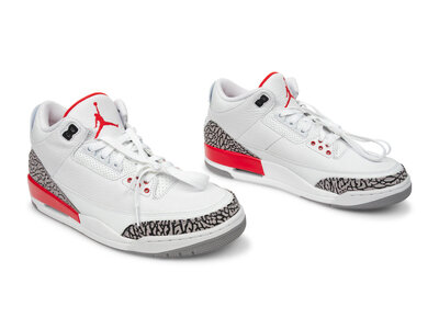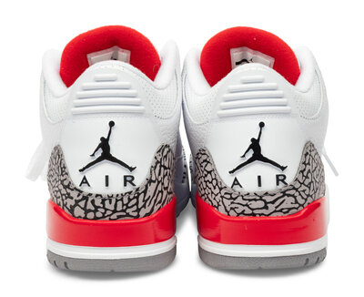 Released on 5/12/18, the Jordan 3 Retro "Hall of Fame" features a white leather upper with classic cement grey and black elephant print overlays. Fire Red accents on the eyelets, Jumpman logo, and outsole add a vibrant touch. This edition celebrates Michael Jordan’s induction into the Naismith Basketball Hall of Fame with a clean and meaningful design.