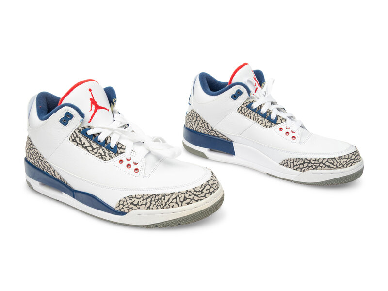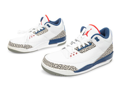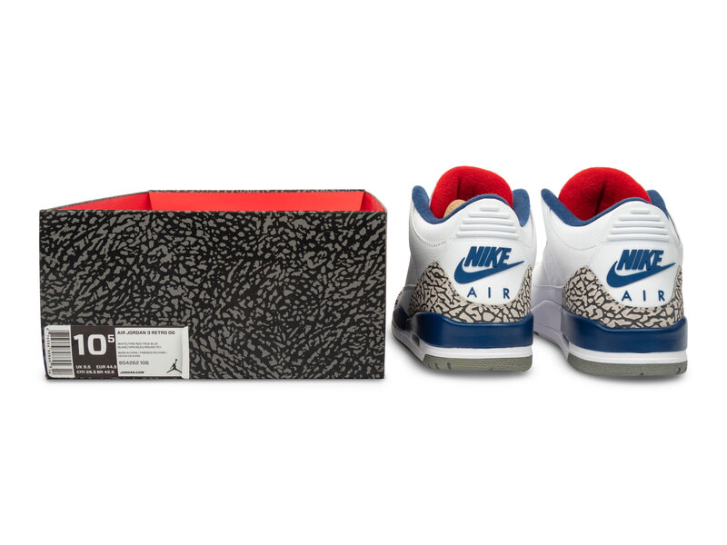 Released on November 25, 2016, the Jordan 3 Retro OG "True Blue" features a white tumbled leather upper with classic cement grey elephant print overlays. True Blue accents highlight the midsole, eyelets, and tongue, while Fire Red detailing adds a vibrant touch. The design is completed with the original "Nike Air" branding on the heel and insole, staying true to the 1988 original.