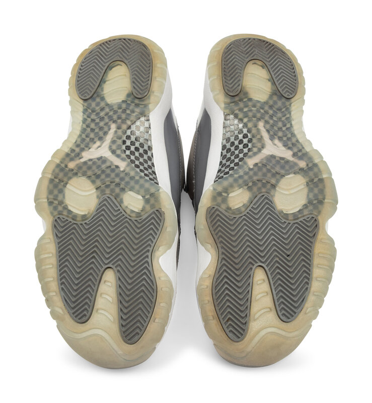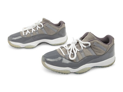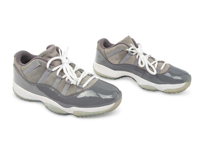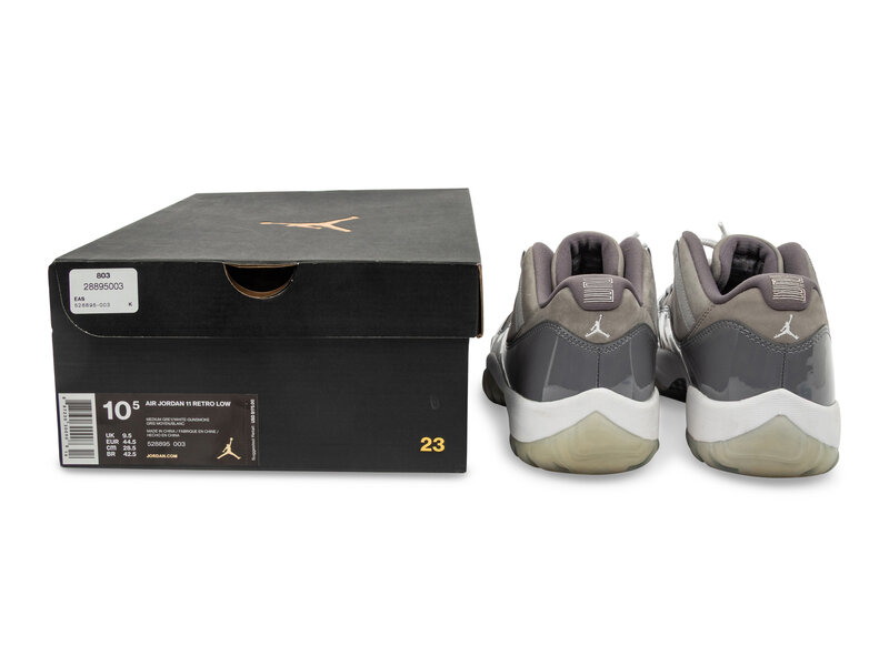Released on April 28, 2018, the Jordan 11 Retro Low "Cool Grey" revives the classic 2001 colorway in low-top form. It features a medium grey suede upper with darker grey patent leather overlays, white laces, and a white midsole. The design is completed with an icy blue translucent outsole, offering a clean and stylish look.