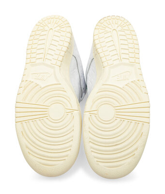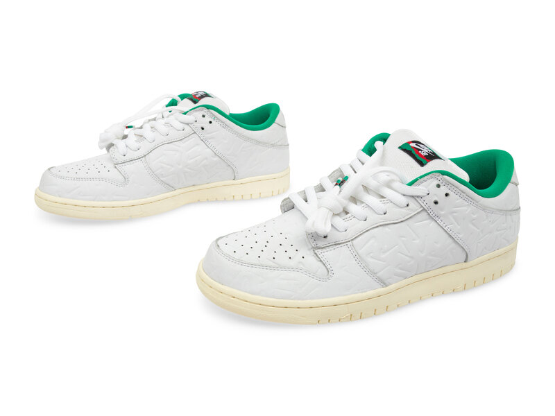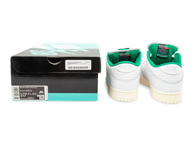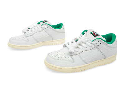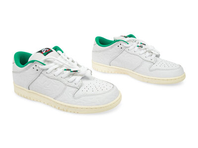 Released on October 5, 2019, the Nike SB Dunk Low "Lucid Green" is a collaboration with Amsterdam-based skate shop Ben-G. This edition features a white leather upper adorned with an all-over debossed Swoosh pattern, complemented by green accents on the tongue label, lace tips, and inner lining. The design is completed with a Sail midsole and a custom insole showcasing a repeated Swoosh motif. Ben-G's branding replaces the traditional Nike branding on the heel, adding a unique touch to this skate-inspired sneaker.